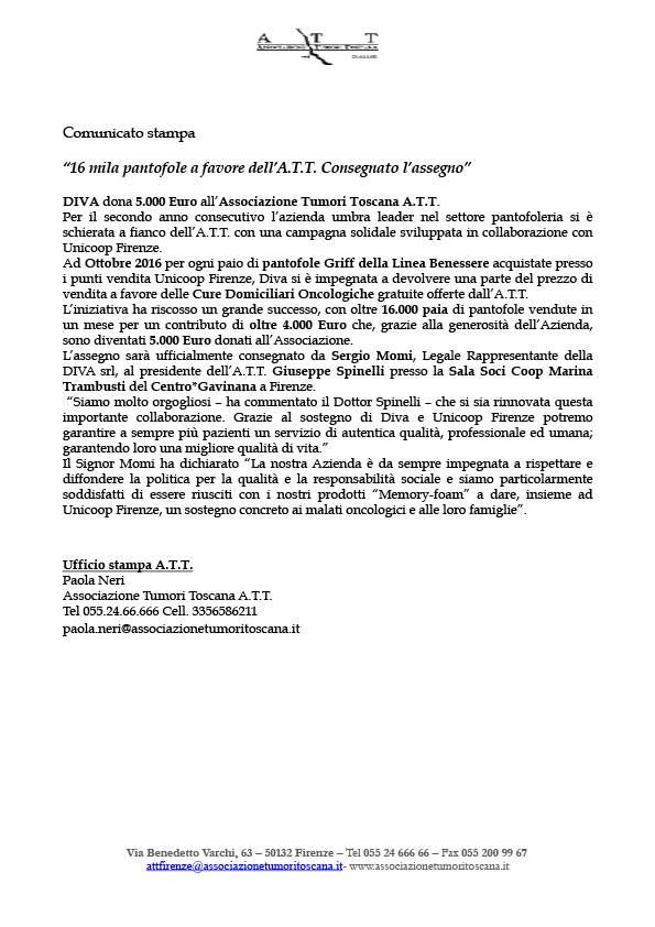 Anche nel 2016 Diva Intimo ha sostenuto l’A.T.T. con una campagna solidale in collaborazione con Unicoop Firenze, devolvendo parte del prezzo di vendita delle pantofole Griff – dell’innovativa linea Benessere in Memory Foam – a favore delle Cure Domiciliari Oncologiche gratuite offerte dall’A.T.T.